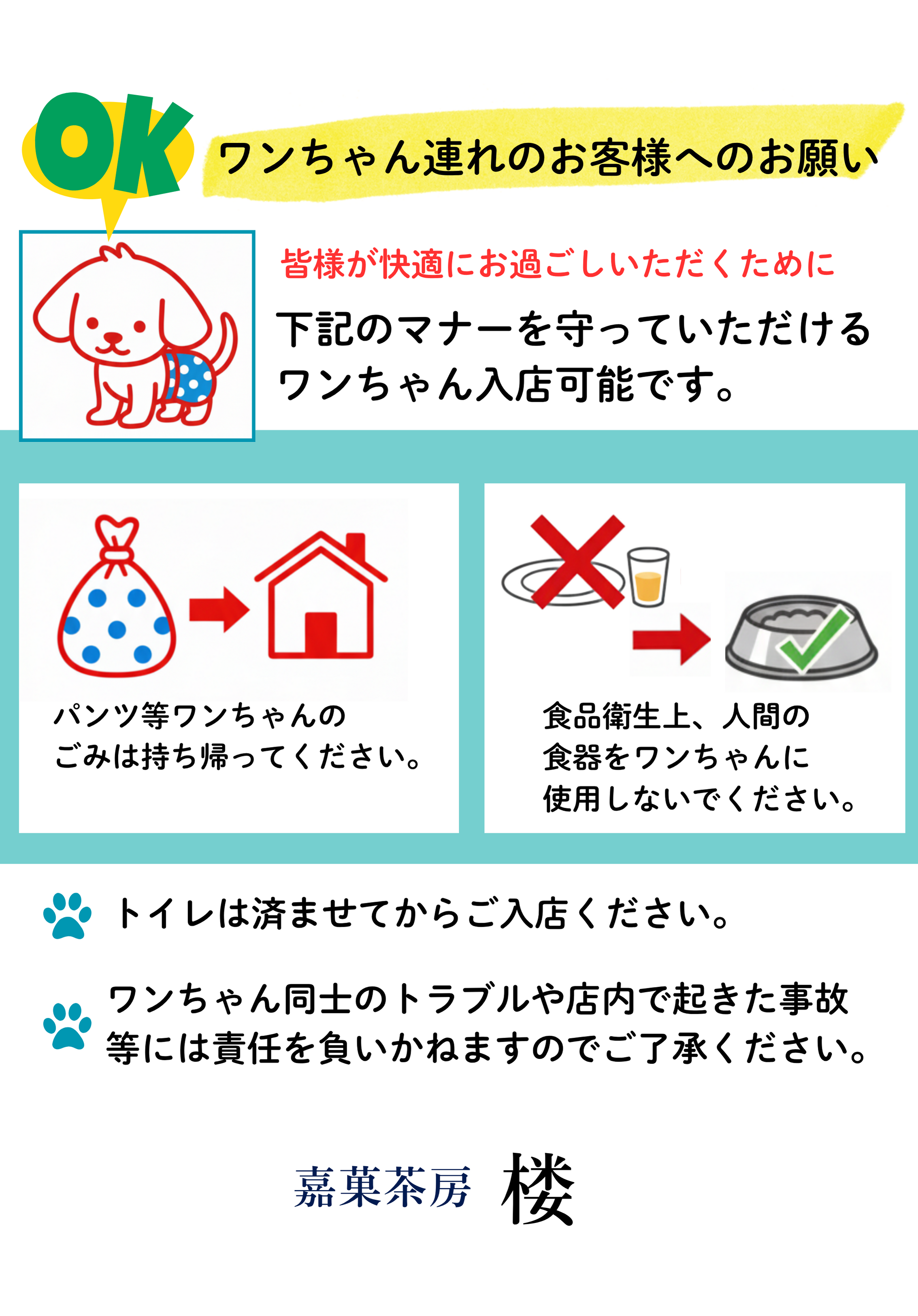 - ほかのお客様・ワンちゃんへの配慮のため、吠え続ける場合は一時的に店外で落ち着かせるなどご対応をお願いします。