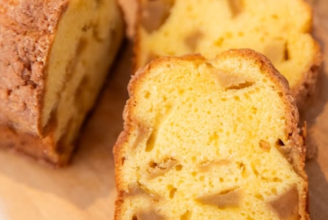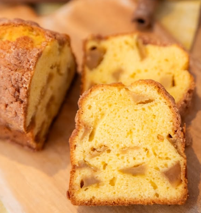 法多山のお観音様におすそ分けいただいた林檎をカラメルでじっくり煮て、生地にごろごろ混ぜ込んだ福いっぱいのパウンドケーキ
